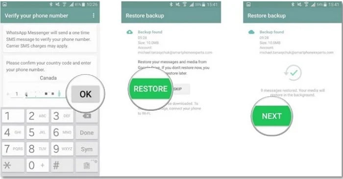 در این قسمت، تاریخ آخرین پشتیبان‌گیری و اینکه آیا به Google Drive متصل است یا نه را می‌بینید. اگر همه چیز مرتب است، واتساپ را از گوشی خود حذف کنید و دوباره از Google Play Store نصب کنید. هنگام ورود با شماره تلفن‌تان، برنامه به طور خودکار نسخه پشتیبان را پیدا می‌کند و از شما می‌پرسد که آیا می‌خواهید چت‌ها را بازیابی کنید. با زدن گزینه Restore، پیام‌های شما به حالت قبل برمی‌گردند.